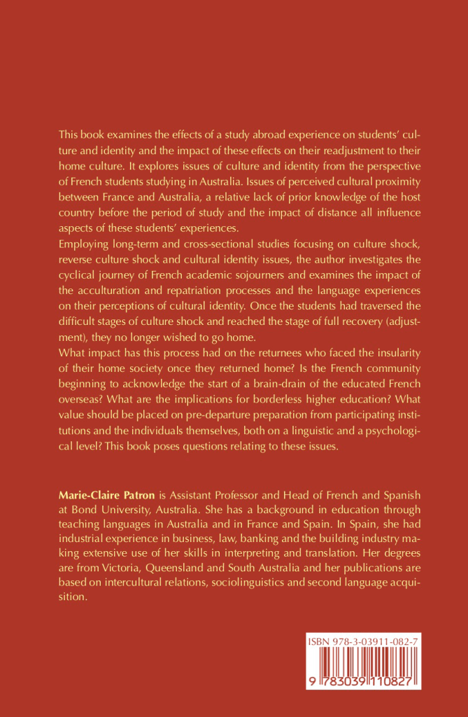 This book examines the effects of a study abroad experience on students’ culture and identity and the impact of these effects on their readjustment to their home culture. It explores issues of culture and identity from the perspective of French students studying in Australia. Issues of perceived cultural proximity between France and Australia, a relative lack of prior knowledge of the host country before the period of study and the impact of distance all influence aspects of these students’ experiences. Employing long-term and cross-sectional studies focusing on culture shock, reverse culture shock and cultural identity issues, the author investigates the cyclical journey of French academic sojourners and examines the impact of the acculturation and repatriation processes and the language experiences on their perceptions of cultural identity. Once the students had traversed the difficult stages of culture shock and reached the stage of full recovery (adjustment), they no longer wished to go home. What impact has this process had on the returnees who faced the insularity of their home society once they returned home? Is the French community beginning to acknowledge the start of a brain-drain of the educated French overseas? What are the implications for borderless higher education? What value should be placed on pre-departure preparation from participating institutions and the individuals themselves, both on a linguistic and a psychological level? This book poses questions relating to these issues.